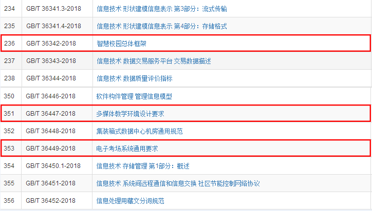 2018年06月07日,国家市场监督管理总局、国家标准化管理委员会批准了393项国家标准和7项国家标准外文版。其中,同方艾威康参与制定的第236项《智慧校园总体框架》(GB/T 36342-2018)、第351项《多媒体教学环境设计要求》(GB/T 36447-2018)、第353项《电子考场系统通用要求》(GB/T 36449-2018)三项国家标准正式发布。